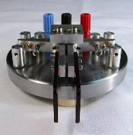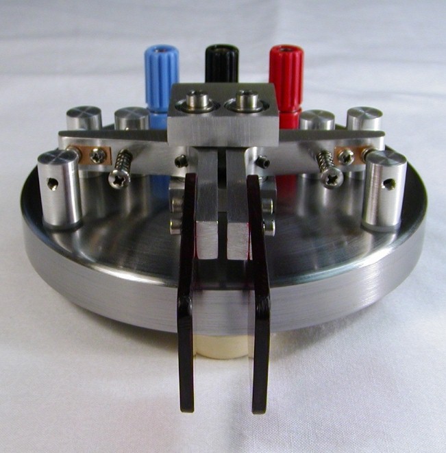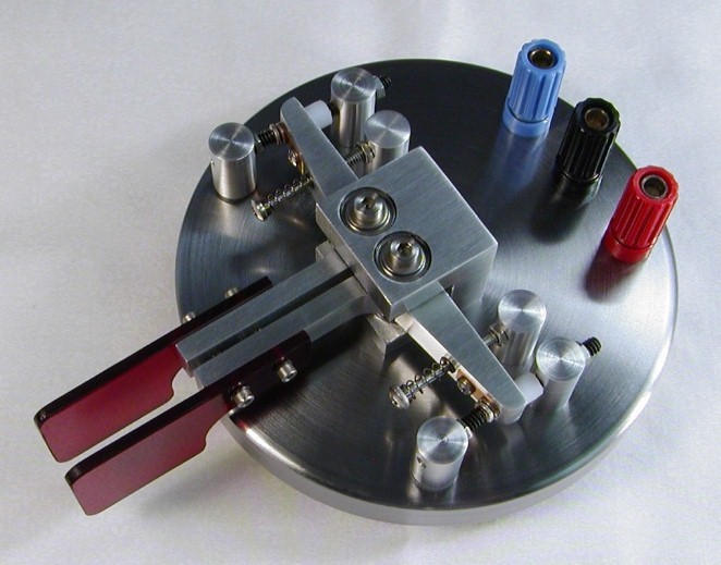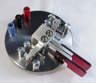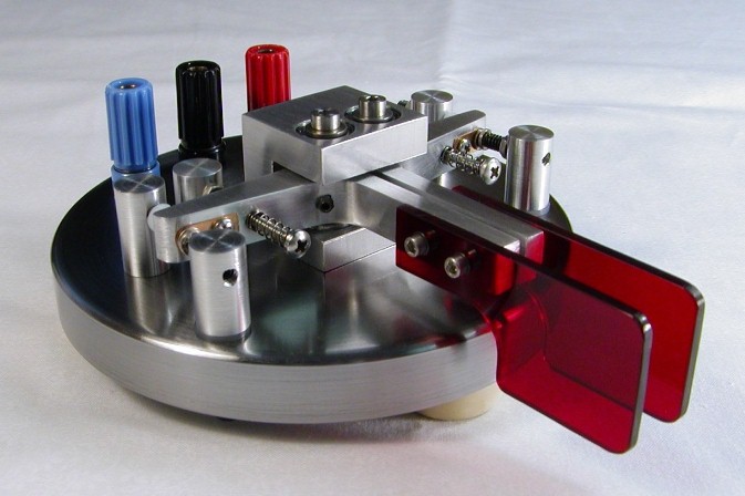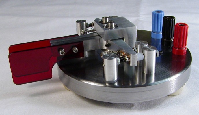 This paddle was given to me by a friend of mine who wanted me to try out his design. This prototype unit lacked the "presentation finish" that many of us like on our paddles, but the design was so solid I felt it was more than worthy of a makeover to give it an appearance that matched its functional quality. For years now this paddle has been my "daily driver". Except for the base, most of the parts on this paddle are aluminum. For weight, the base is steel (not stainless unfortunately) that I sprayed with a clear coat to keep it from rusting. The paddle levers pivot on shafts supported at both ends by sealed ball bearings which are glued into the central bearing block. Small setcrews and some glue hold the levers on the shafts. The levers themselves are made from slices of large extruded aluminum angle. The contacts are silver buttons scrounged from relays and are soldered to the stationary adjustment screws. Since the contacts couldn't be soldered to the aluminum levers, they were left attached to small pieces of their original relay armatures which were then screwed into the levers. Tension is provided by ballpoint pen springs which are coaxial with the tension adjustment screws. The springs also give an additional current return path to ground for the moving contacts in addition to the path through the ball bearings. All adjustment screws are held in place with jam nuts. This method is simple to construct, but adjustments can be a tedious trial and error procedure because the 4-40 threads are fairly coarse and the screw gets loose and wobbly as soon as the jam nut is loosened. Short of going to a fine precision thread, a way around this might be to use split posts with a pinch screw like Bencher does on their paddles. The white caps on the return stop screws are Teflon bumpers to quiet the return click. I haven't noticed a contact spacing drift problem due to these deforming over time, but you could argue that Teflon might not be the right material to use here. Since I made the initial adjustments, everything on this paddle has stayed put for years, so I haven't felt the need to make any changes to the design. |