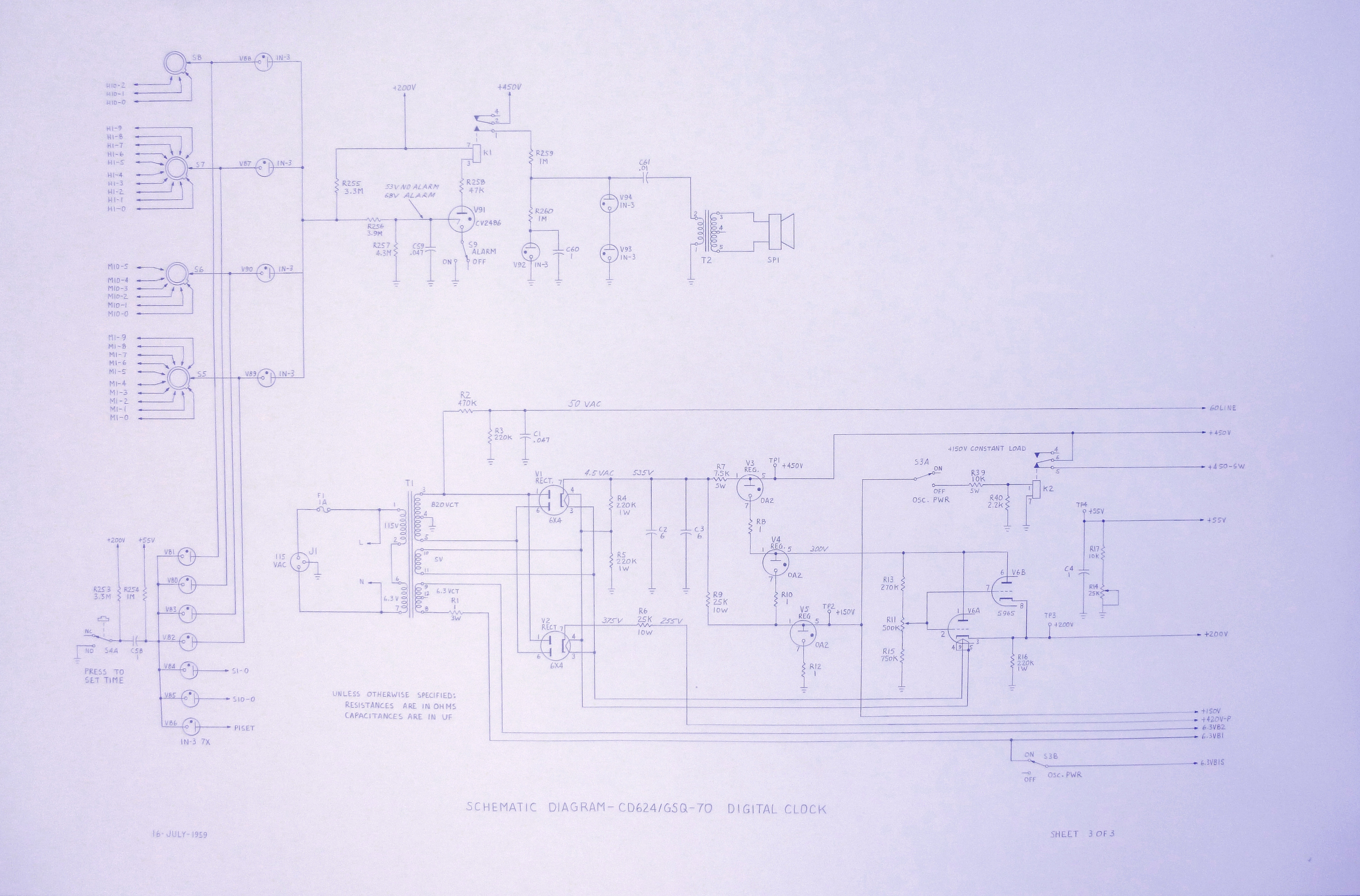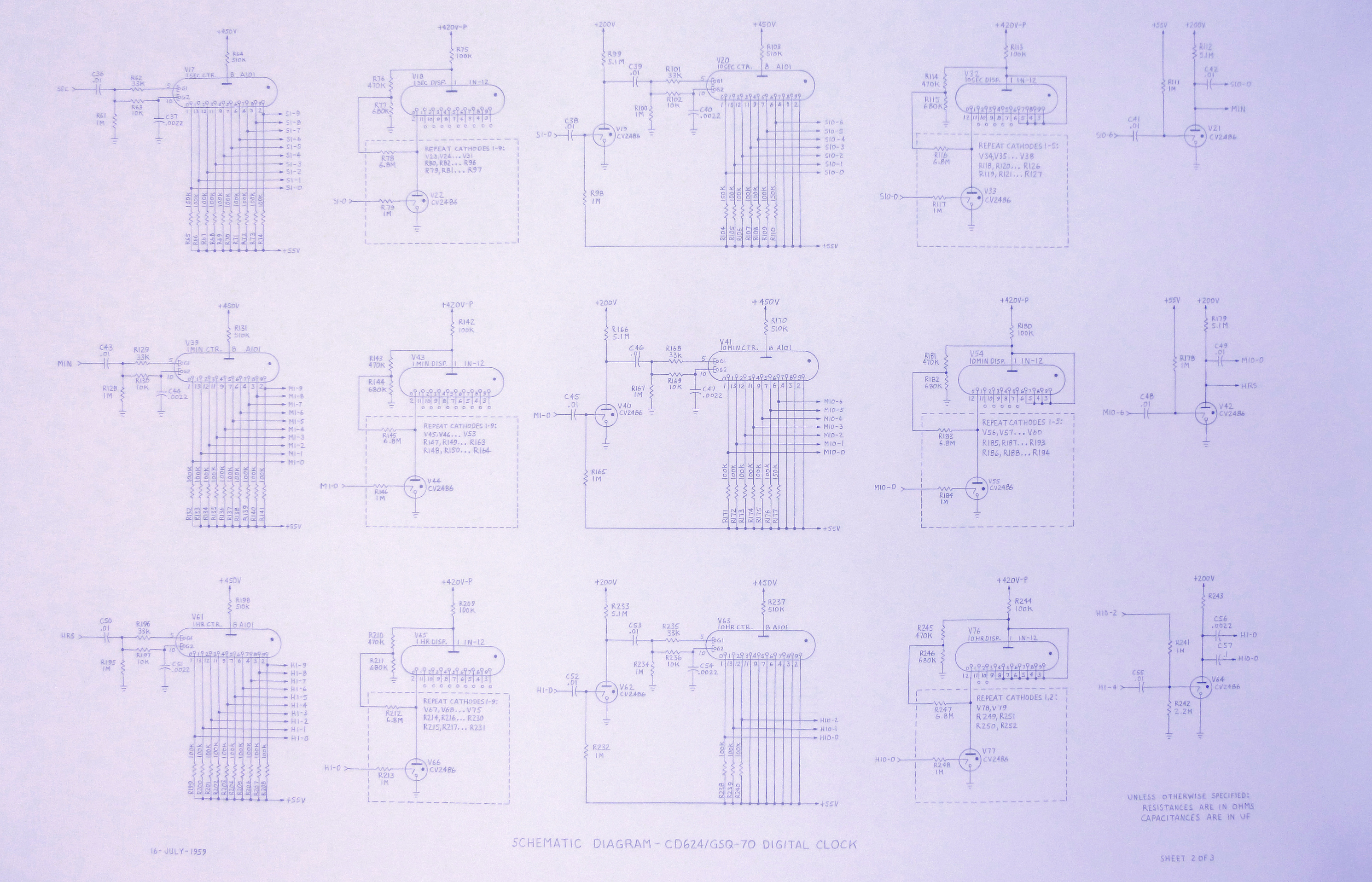 They didn't have CAD in 1959, so of course the schematic for this clock had to be drawn by hand with a T-square, template, triangles, etc. By using some shorthand notations and careful planning, I managed to fit it on three D-size (22 x 34") sheets. Or all three pages in a pdf: |